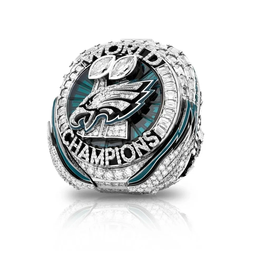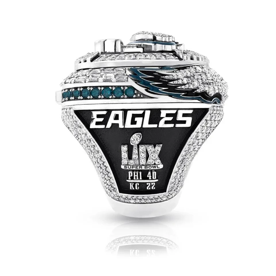 - 0.9 carats of diamonds on the wings to represent the defense's six sacks and three turnovers in Super Bowl LIX