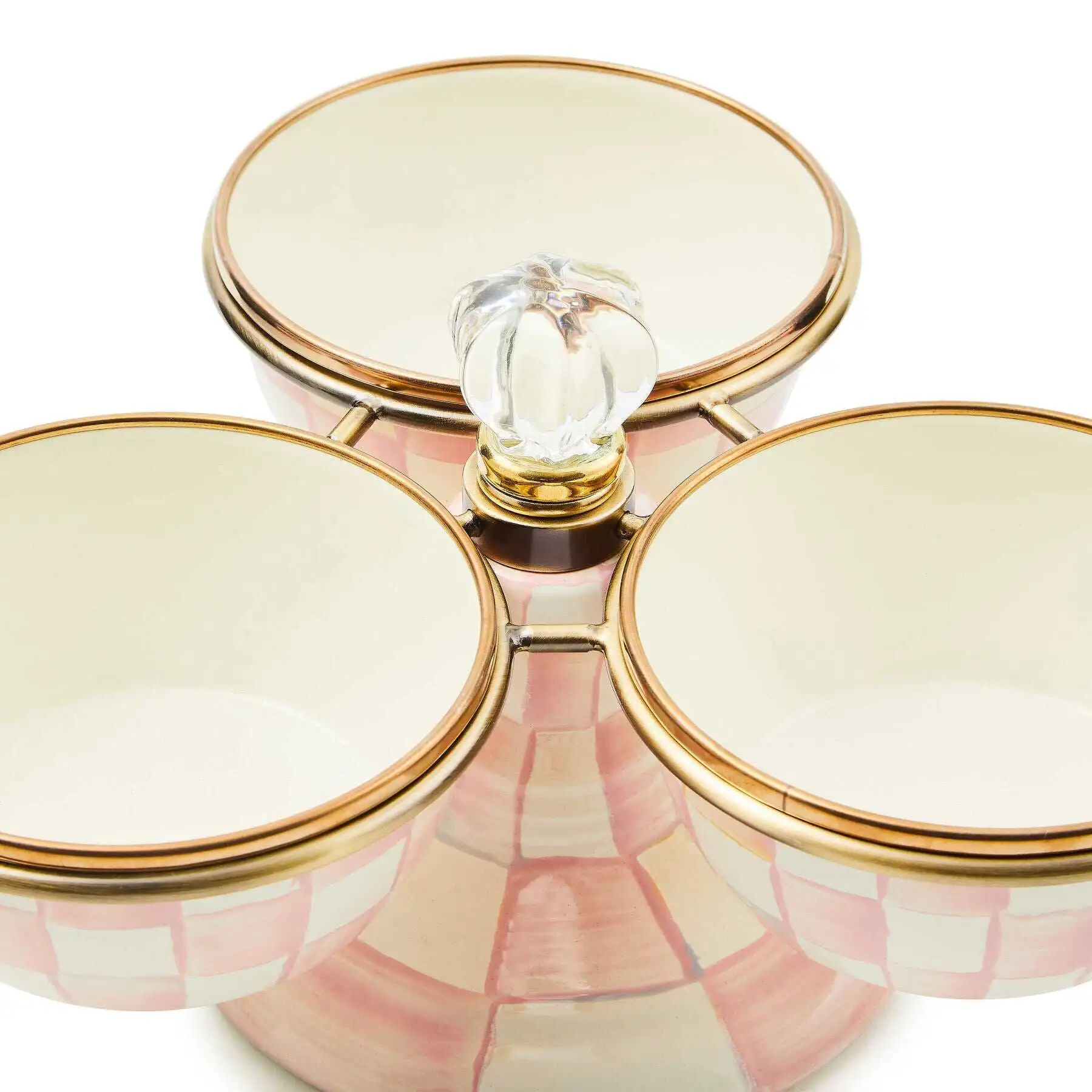 The Rosy Check? Triplicity brings a little height to your kitchen displays while saving on precious counter space. The stand and accompanying 1.5 cup Pinch Bowls are hand-glazed heavy-gauge steel with hand-painted Rosy Check decoration. The bowls remove from the stand for easy cleaning.