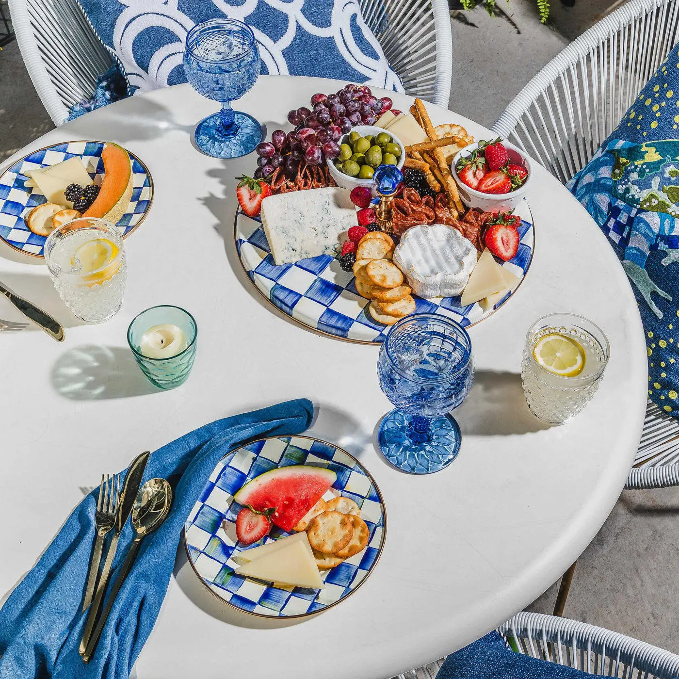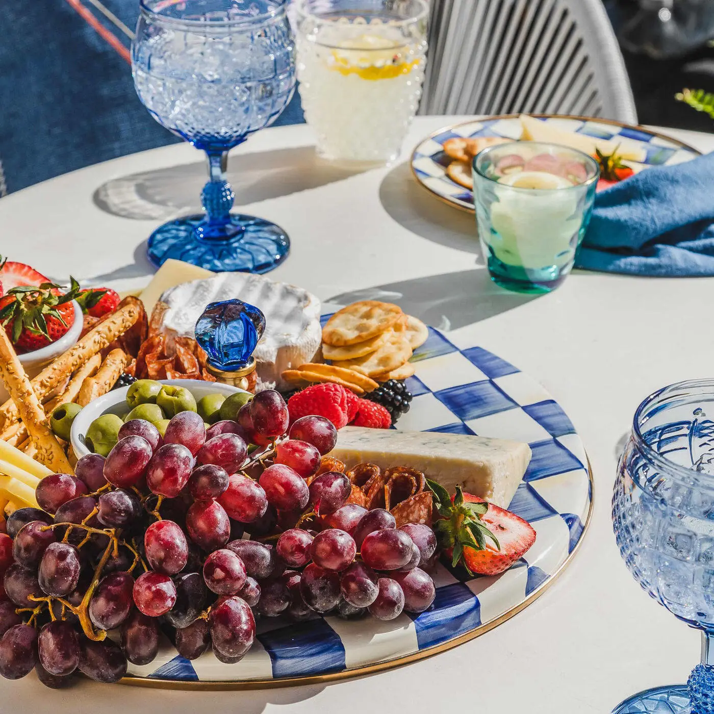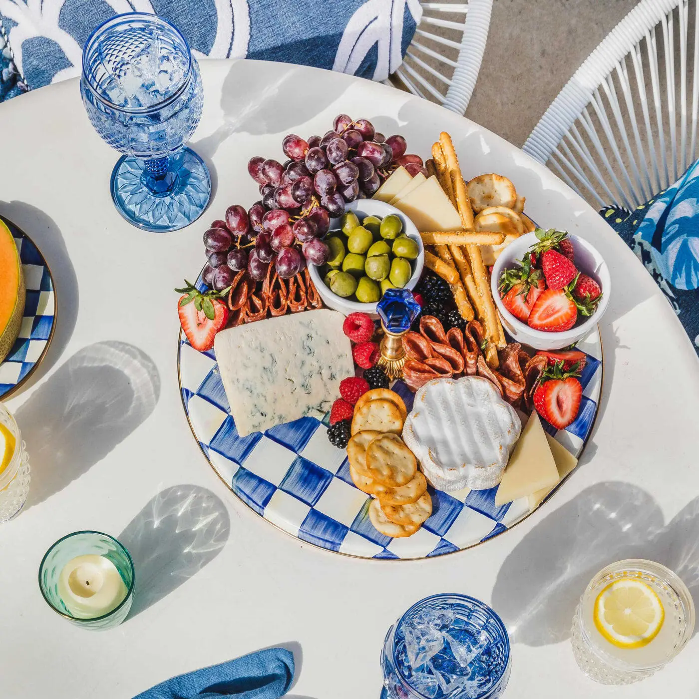 Whether you��re creating a charcuterie or presenting pastries, the Royal Check Enamel Cheese Course serves with style. It features our hand-painted blue checks on a heavy-gauge, hand-glazed steel underbody, topped with a blue glass knob for easy handling.