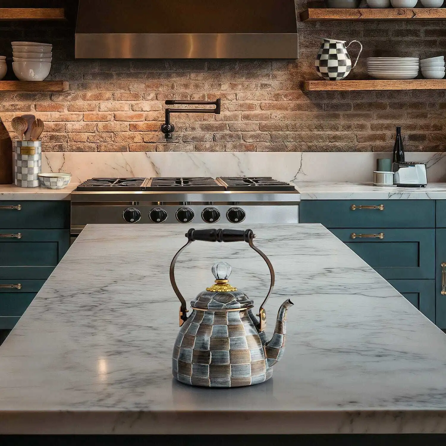Suit your personali-tea with The Tea Kettle Collective. The handsome Sophisticheck 2 Quart Tea Kettle complements sleek industrial design, featuring hand-painted grey and bronze checks on a heavy-gauge steel underbody, finished with a wood handle and a clear glass knob on the lid. Each special-edition Collective kettle makes a great cup of tea, of course, and adds MacKenzie-Childs style to your stovetop. Don’t be surprised that you need more than one.