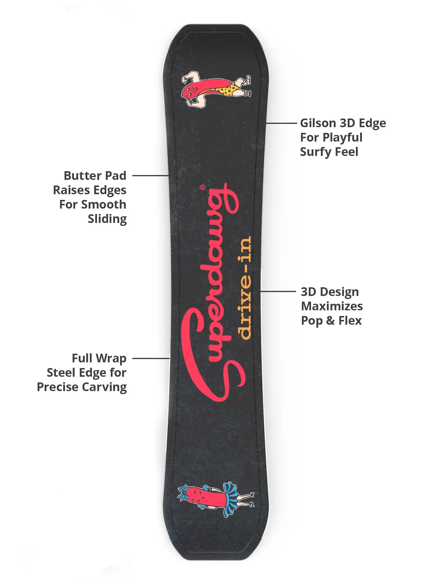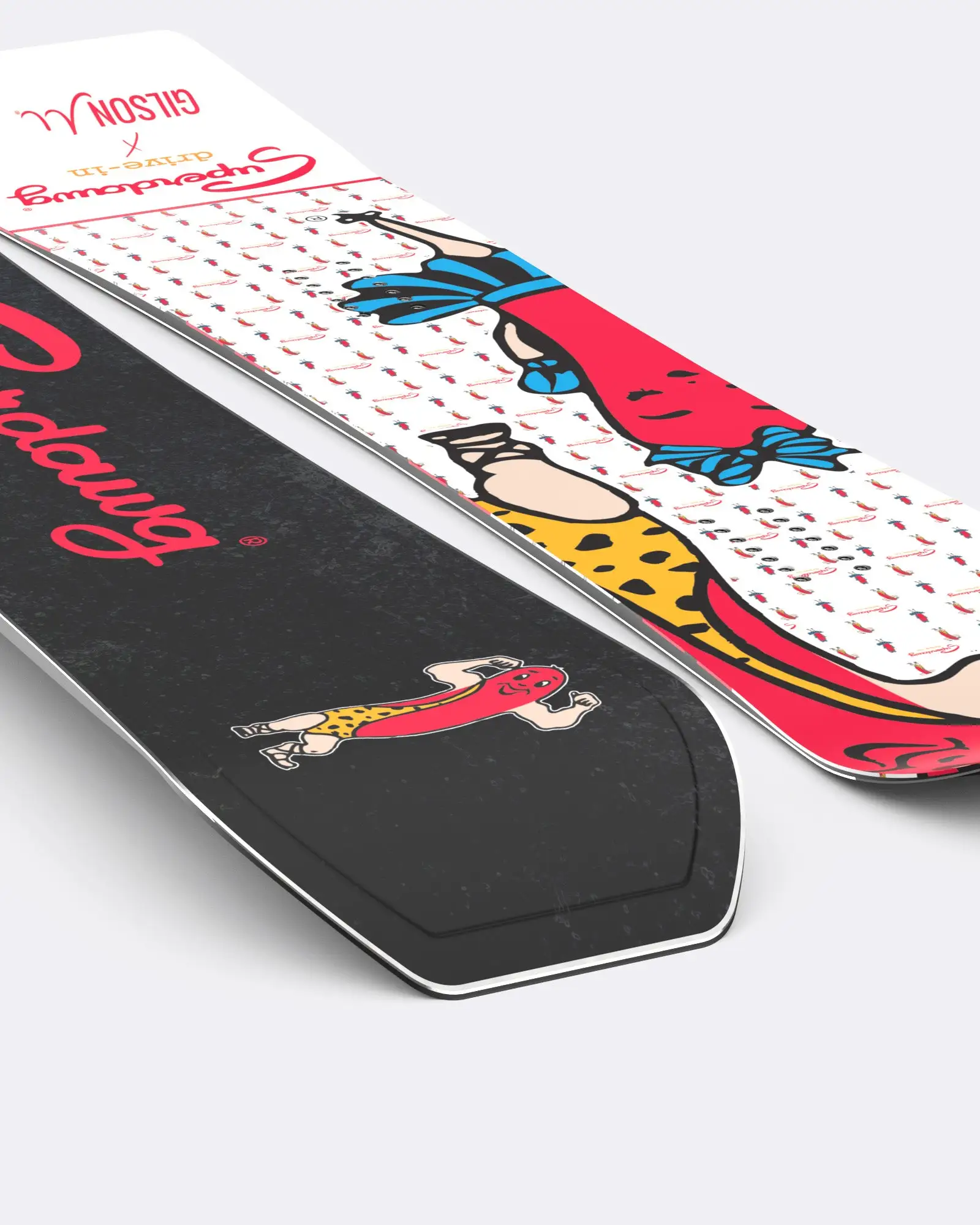Celebrate an iconic Chicago favorite with the Superdawg Limited Edition Freestyle Flat-to-Rocker Snowboard. Featuring the legendary Superdawg characters, this collab brings playful energy and hometown pride straight to the slopes. Built on GILSON’s original Flat-to-Rocker Freestyle design, this board is packed with buttery smooth flex, tons of pop, and a forgiving feel that accelerates progression. Handcrafted in the USA and backed by a 5-year warranty, it’s a ride that’s as fun and unforgettable as the drive-in itself.