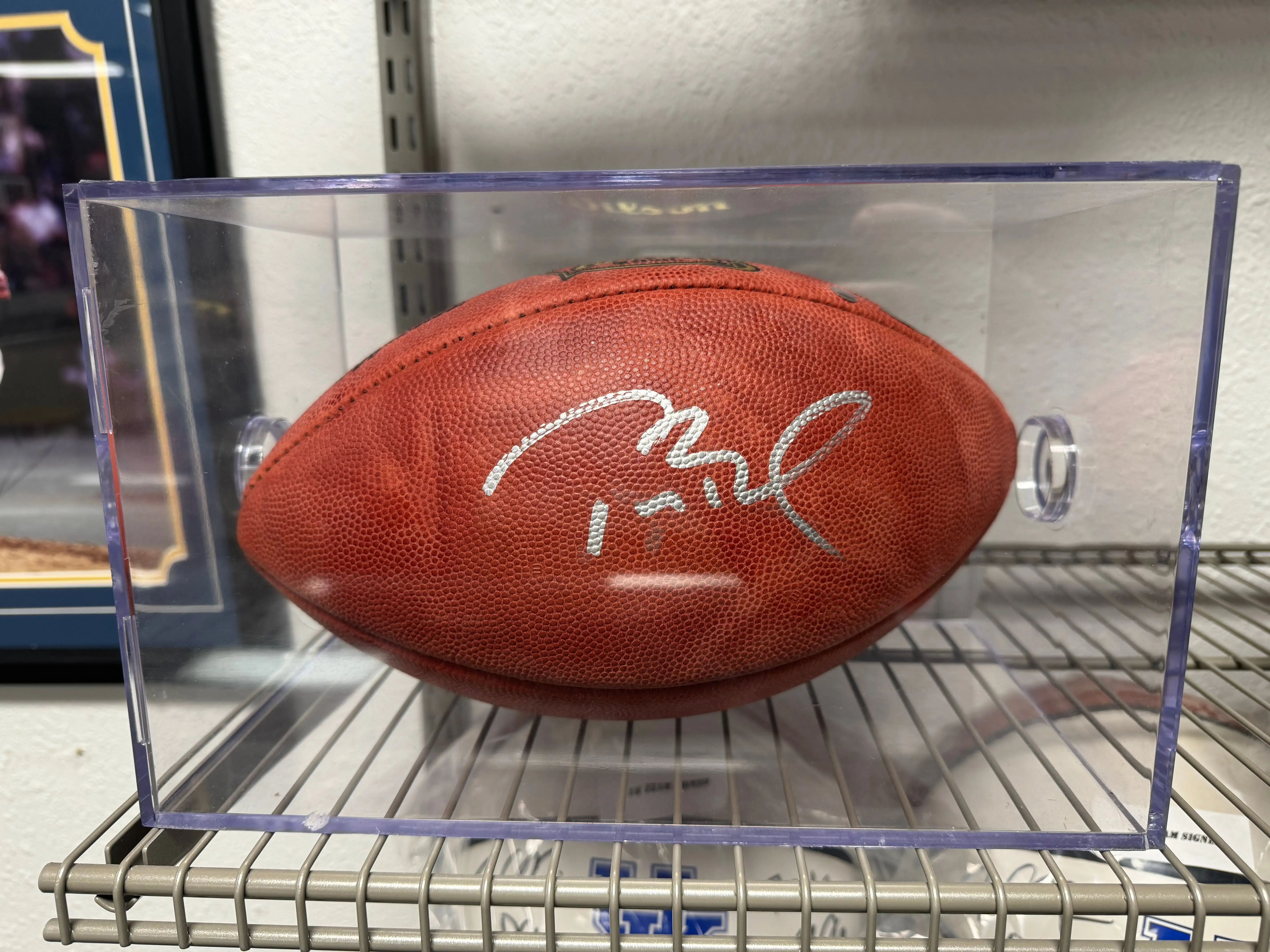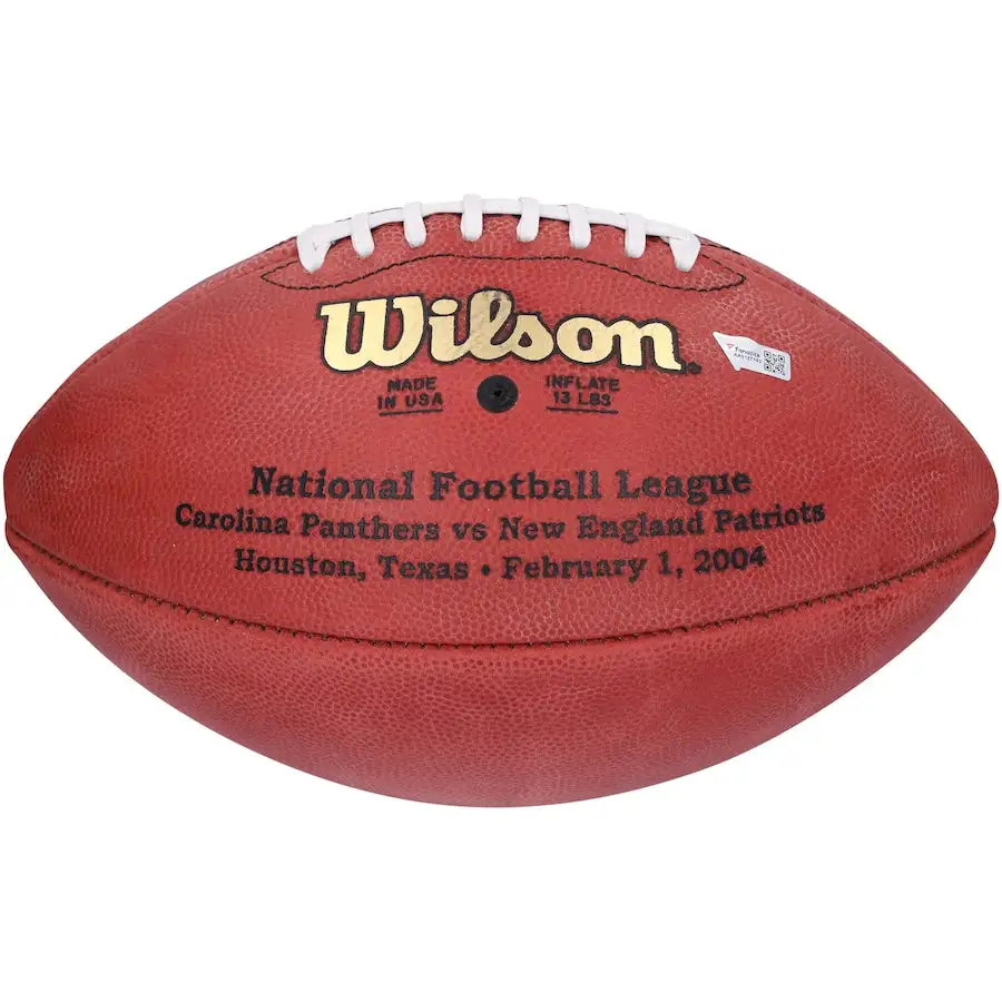 Pay homage to the greatest quarterback in NFL history with this New England Patriots Tom Brady Autographed Wilson Super Bowl XXXVIII Pro Football. Through his 20+ years in the league, Brady has become the most decorated football player ever, winning seven Super Bowls, being named NFL MVP three times, and holding records for most career passing yards, touchdowns, completions and quarterback wins, to name a few. Not only has he won seven championships, but he has gotten to the big game a whopping ten times, which is four more than any other player in league history. Being the star quarterback that he is, it is no surprise that of the seven Super Bowls he has won, he has won the game's MVP five times and has compiled more than 3,000 passing yards and 21 touchdown passes in Super Bowls alone. His 76% career winning percentage trumps that of other Super Bowl-winning quarterbacks who he has battled against throughout his career, such as Peyton Manning, Aaron Rodgers, Drew Brees and Ben Roethlisberger. Even in his 40s, he continues to play at an elite level and doesn't appear to be slowing down, so celebrate his storied career while showing your excitement for what he still has to offer by adding this exciting piece of memorabilia to your New England Patriots collection.