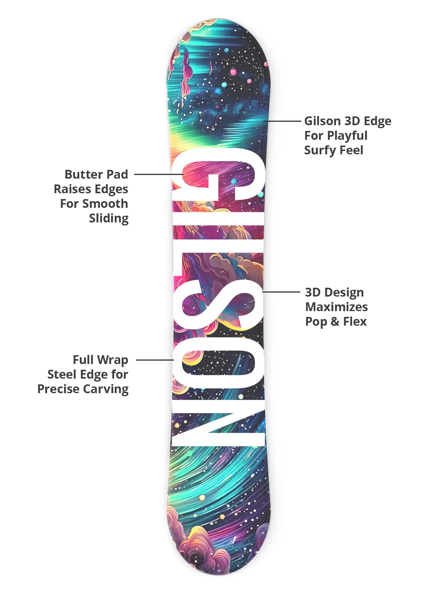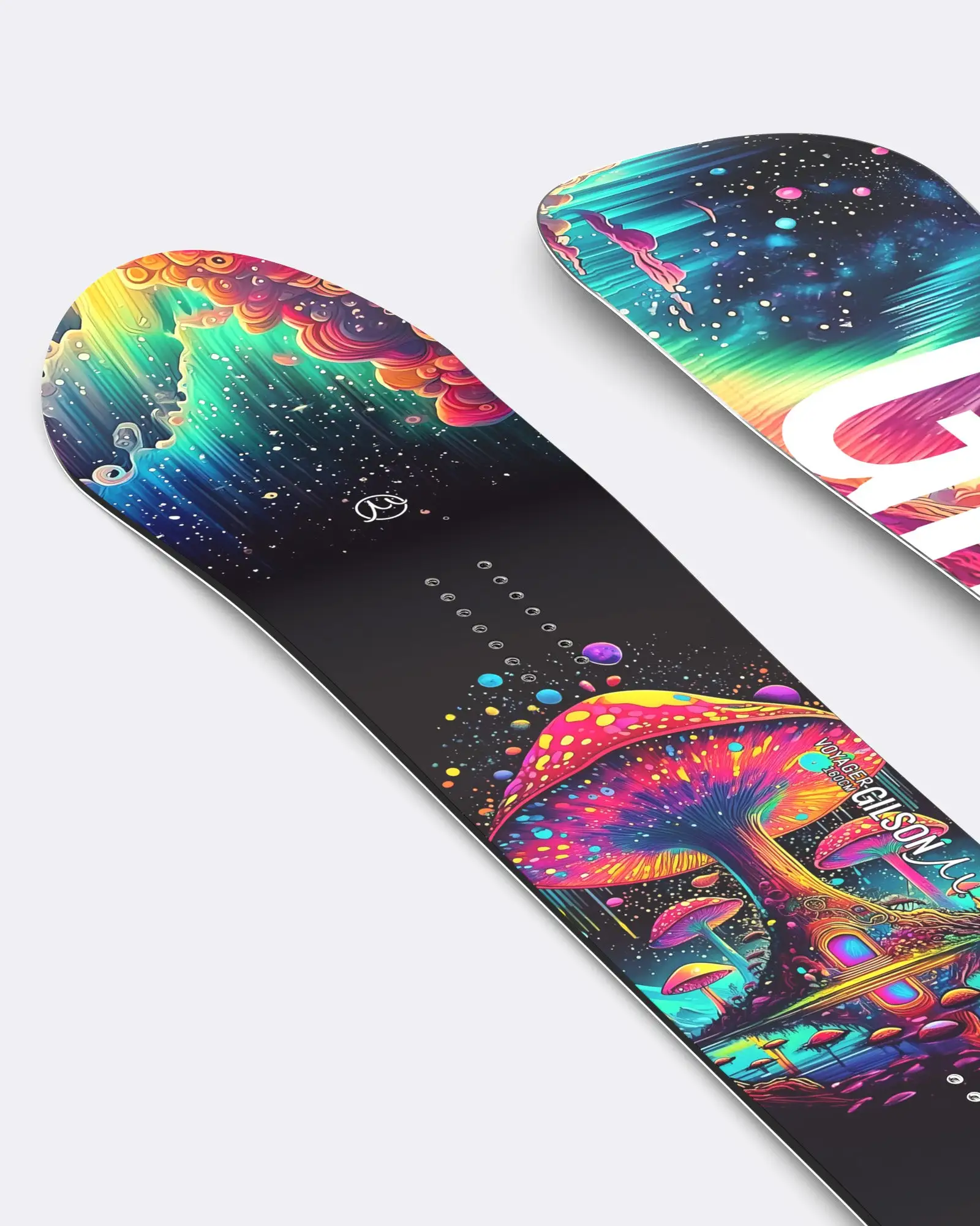 The Voyager Snowboard takes you beyond the ordinary with psychedelic artwork that feels straight from another galaxy. Featuring vibrant cosmic landscapes and surreal detail, this Limited Edition deck is designed to spark curiosity and wonder. Built on GILSON’s Hybrid Camber All Mountain model and backed by a 5 year warranty, it delivers smooth surfy performance across every corner of the mountain.