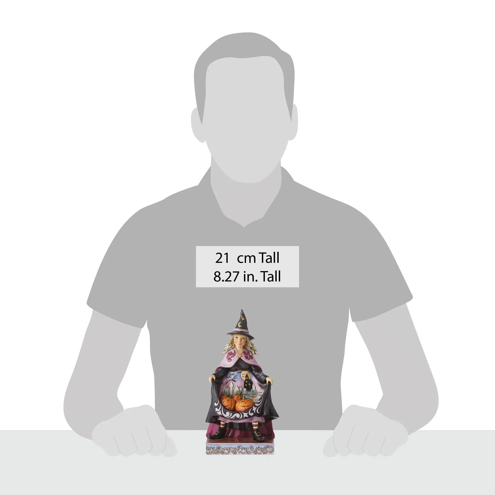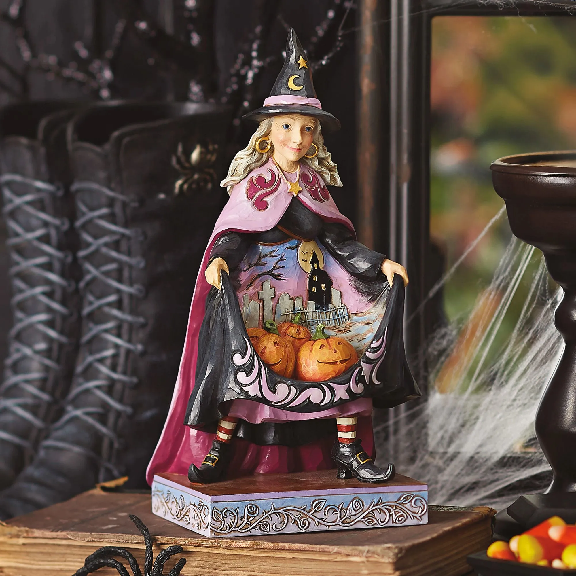 This playful witch from Jim Shore tells a Halloween story with her gown. Skirts hitched, she reveals her red striped socks and pointed shoes under her black and purple robes. Her skirt reveals a spooky graveyard scene with jack-o-lanterns!