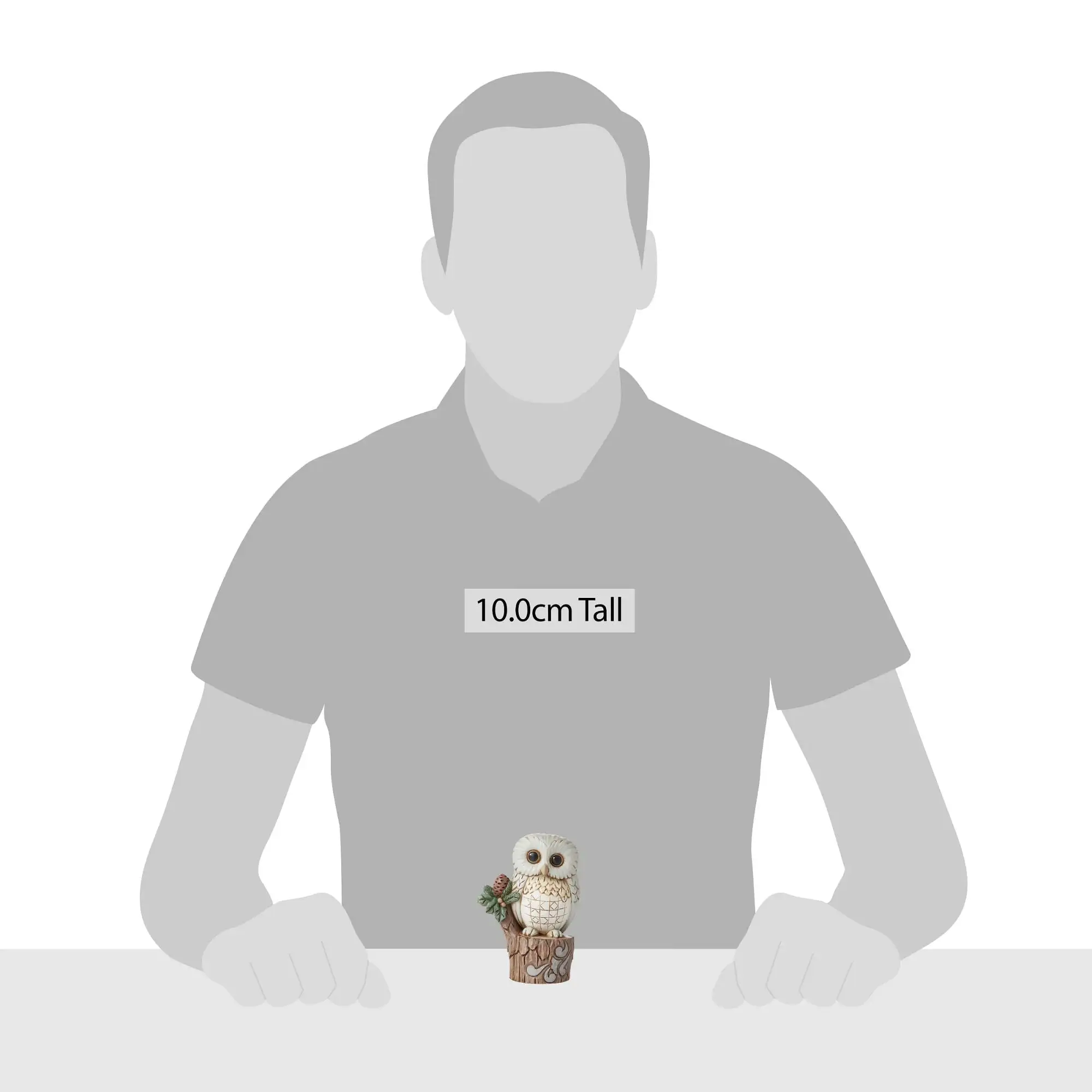 Jim Shore's White Woodland collection celebrates friends of the forest and the beauty of nature in wintertime. Eyes wide with delight and wonder, this little owl perches upon a tree stump with patchwork feathers and pine cone details.