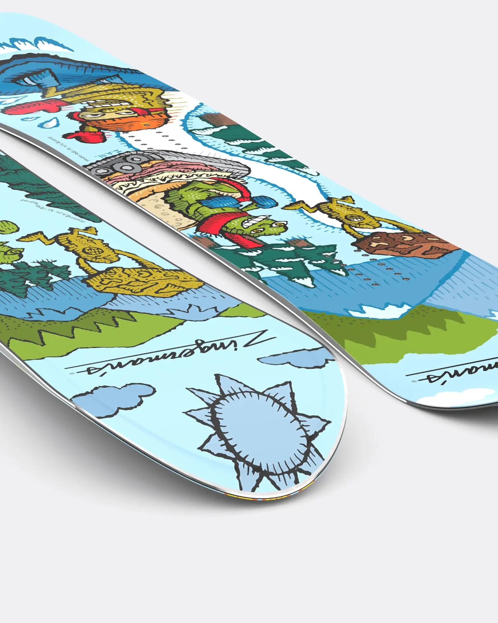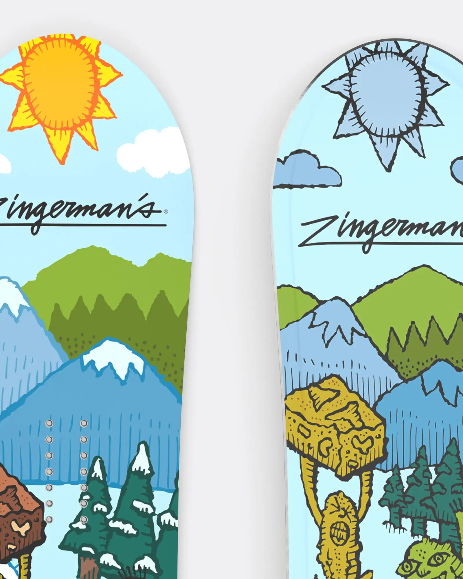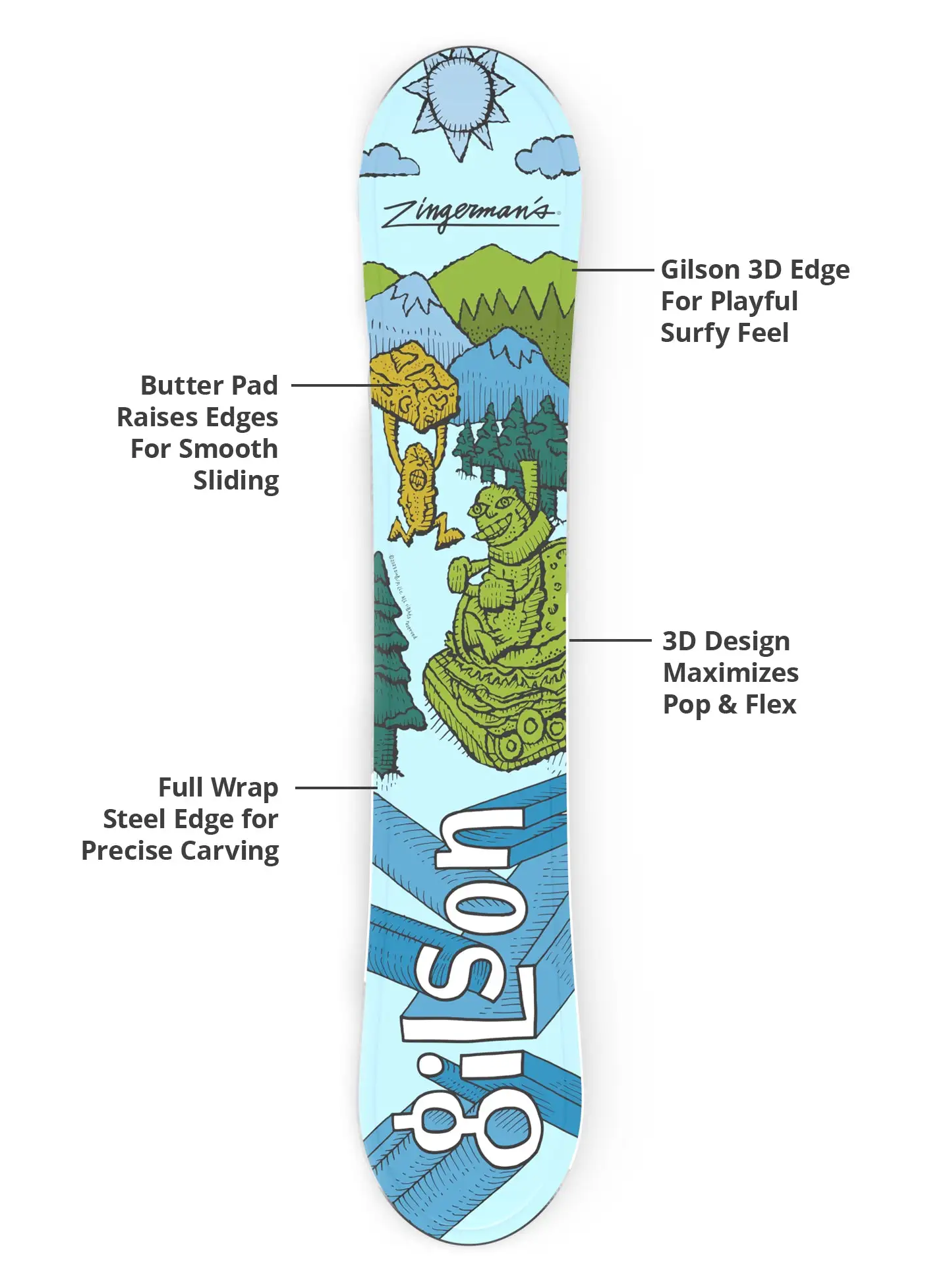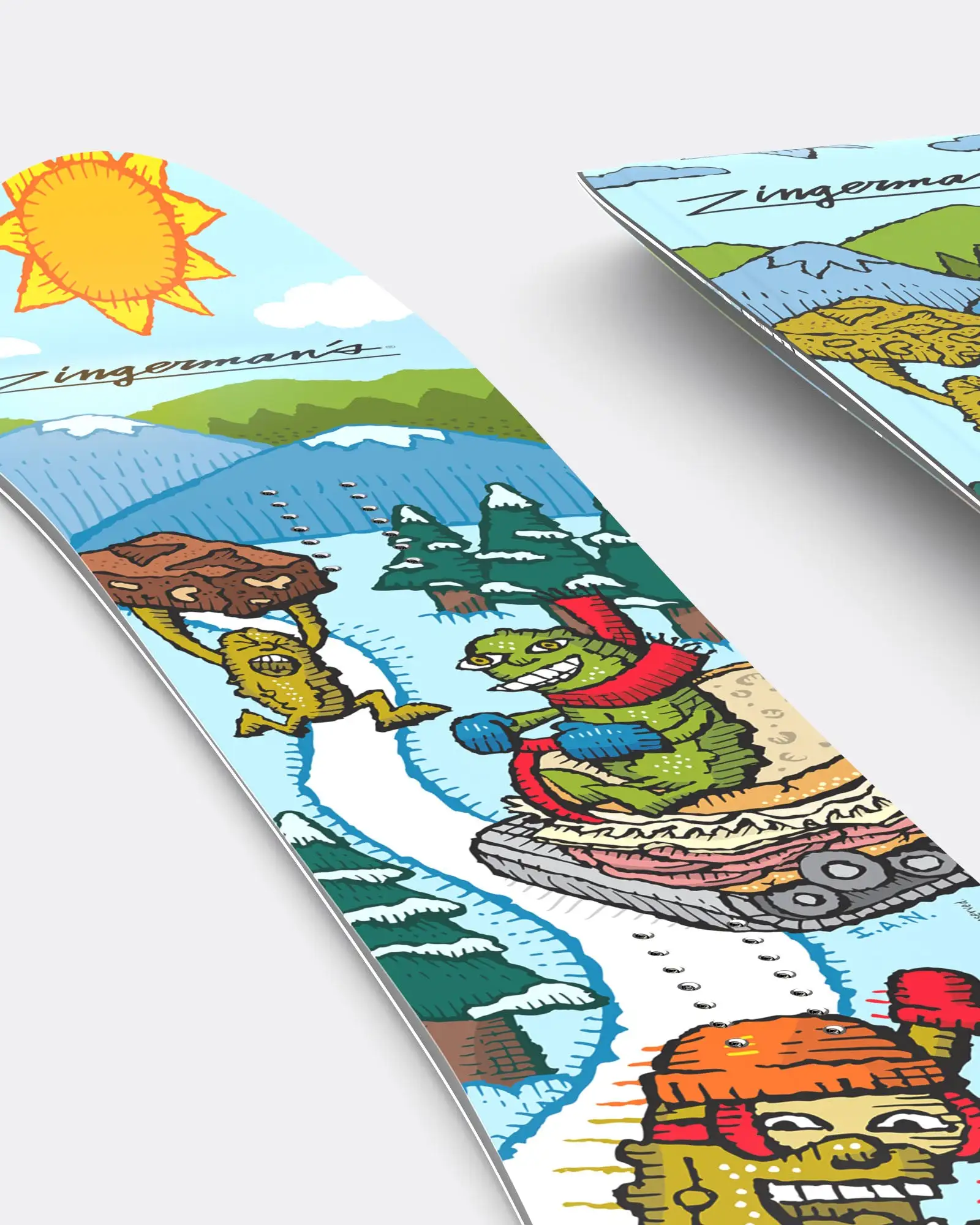 The Zingerman’s x GILSON Snowboard brings a playful twist to the mountain with artwork as bold and quirky as the legendary deli itself. Featuring whimsical food characters riding, carving, and catching air, this Limited Edition deck delivers pure fun. Built on GILSON’s Hybrid Camber All Mountain model and backed by a 5 year warranty, it offers smooth surfy performance and a taste of adventure on every run.