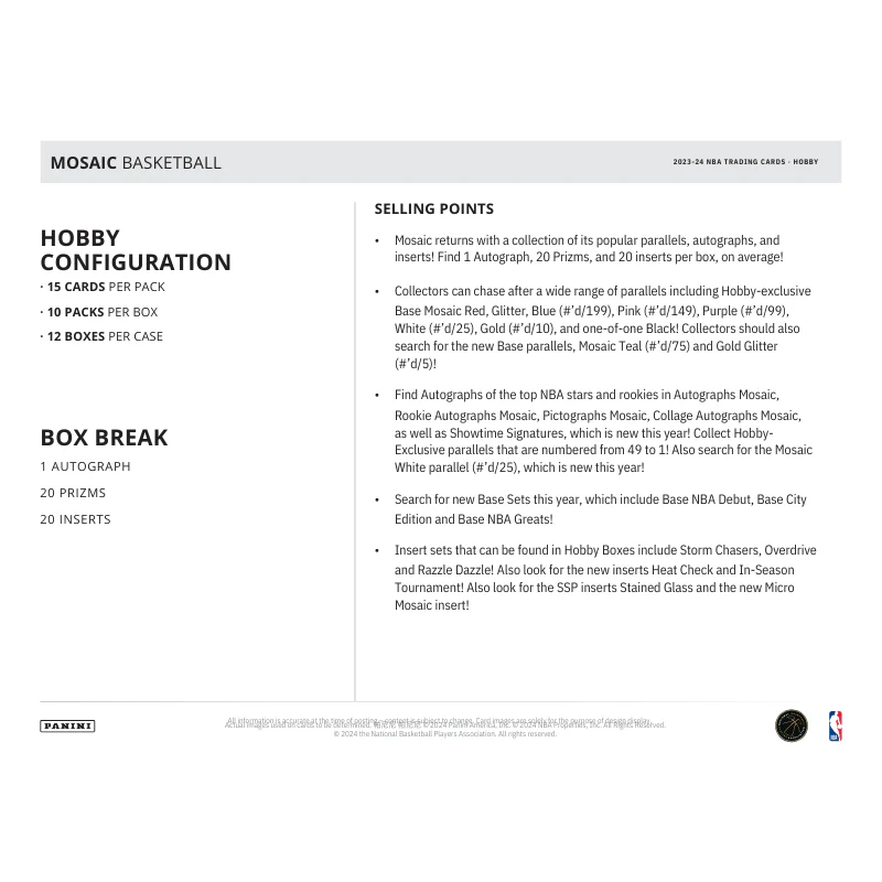 • Mosaic returns with a collection of its popular parallels, autographs, and inserts! Find 1 Autograph, 20 Prizms, and 20 inserts per box, on average!