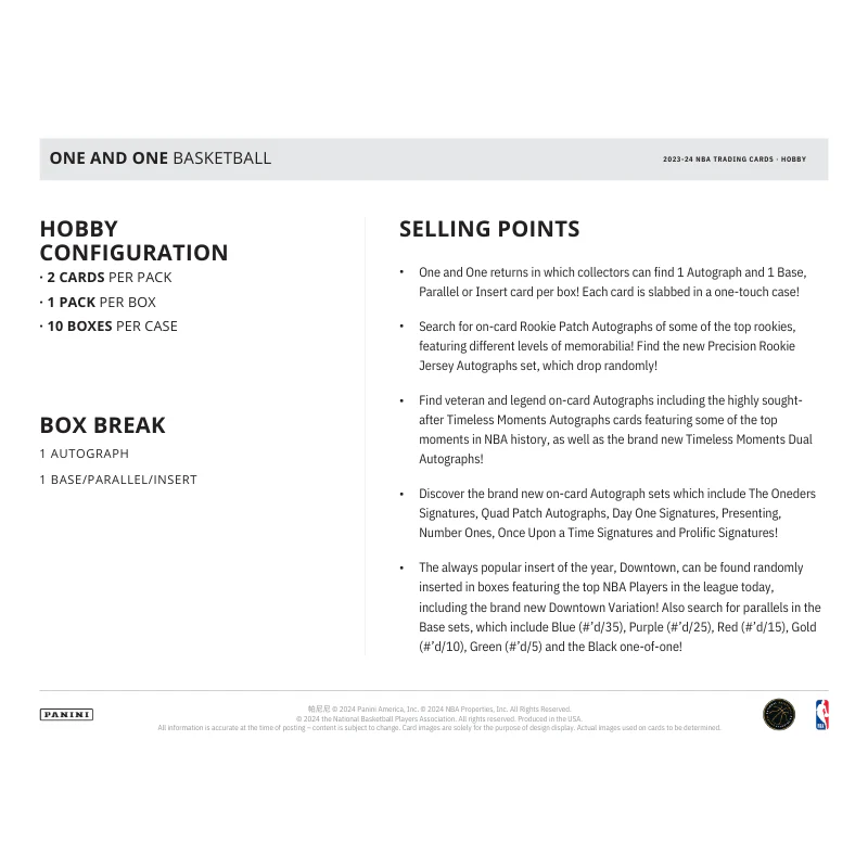 The 2023/24 Panini One & One Basketball Hobby Box brings elite-level collecting to NBA fans with a beautifully curated set focused on premium design and quality. Each box delivers two encapsulated cards: one autograph and one base, parallel, or insert, ensuring every pull is both special and valuable. With on-card autographs from top rookies, current stars, and NBA legends, this set also includes stunning inserts like Timeless Moments, capturing iconic plays, and Downtown, featuring artistic depictions of players and their cities.