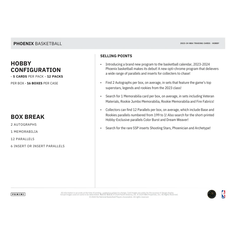 The 2023/24 Panini Phoenix Basketball Hobby Box ignites your collection with a striking blend of vibrant designs and premium content. Known for its dynamic and fiery look, Phoenix Basketball offers a deep checklist of NBA stars, rookies, and legends. Each box delivers a thrilling array of parallels, autographs, and memorabilia cards, making it a must-have for collectors chasing both value and eye-catching aesthetics. With exclusive inserts and the chance to pull rare hits, this hobby box brings the heat to your collection. Get ready to elevate your game with 2023/24 Panini Phoenix Basketball!
