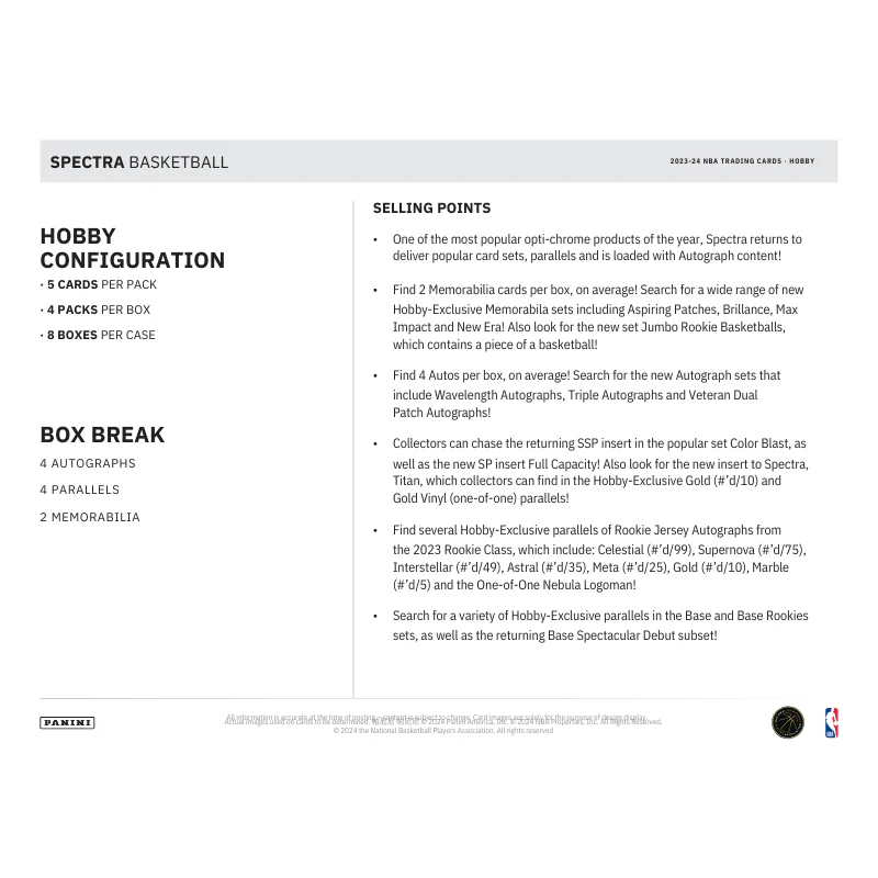 Unveil a world of radiant design and unparalleled basketball excitement with the 2023/24 Panini Spectra Basketball Hobby Box. This premium collection is a must-have for any basketball enthusiast, featuring stunning card technology that captures the essence of the sport's brightest stars and legendary icons. Elevate your basketball card collection with Spectra’s cutting-edge artistry and discover why it remains a favorite among collectors.