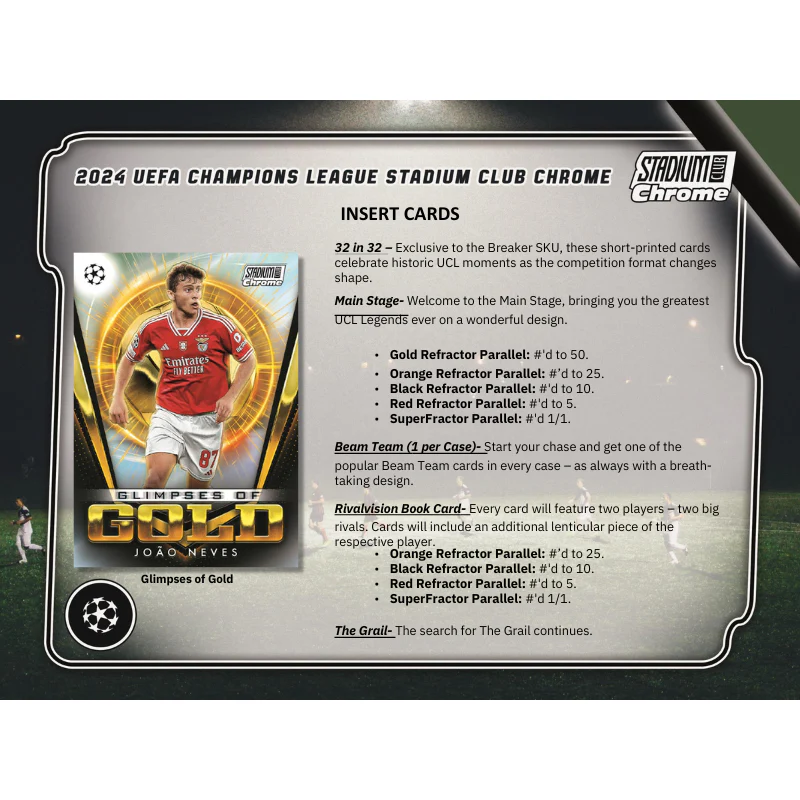 The 2023/24 Topps Stadium Club Chrome UEFA Soccer Breaker’s Delight Box is tailored for fans and collectors who crave the thrill of breaking packs filled with soccer's elite talent. This premium set features high-gloss, full-bleed photography that captures the intensity of UEFA’s top players in action, bringing the game to life like never before. Each box includes an array of exclusive Chrome parallels, autographs, and inserts, showcasing both established stars and rising talents from Europe’s premier clubs. With stunning visuals and a mix of rare pulls, Breaker’s Delight is a must-have for any UEFA fan looking to elevate their collection with Topps' signature Chrome style.