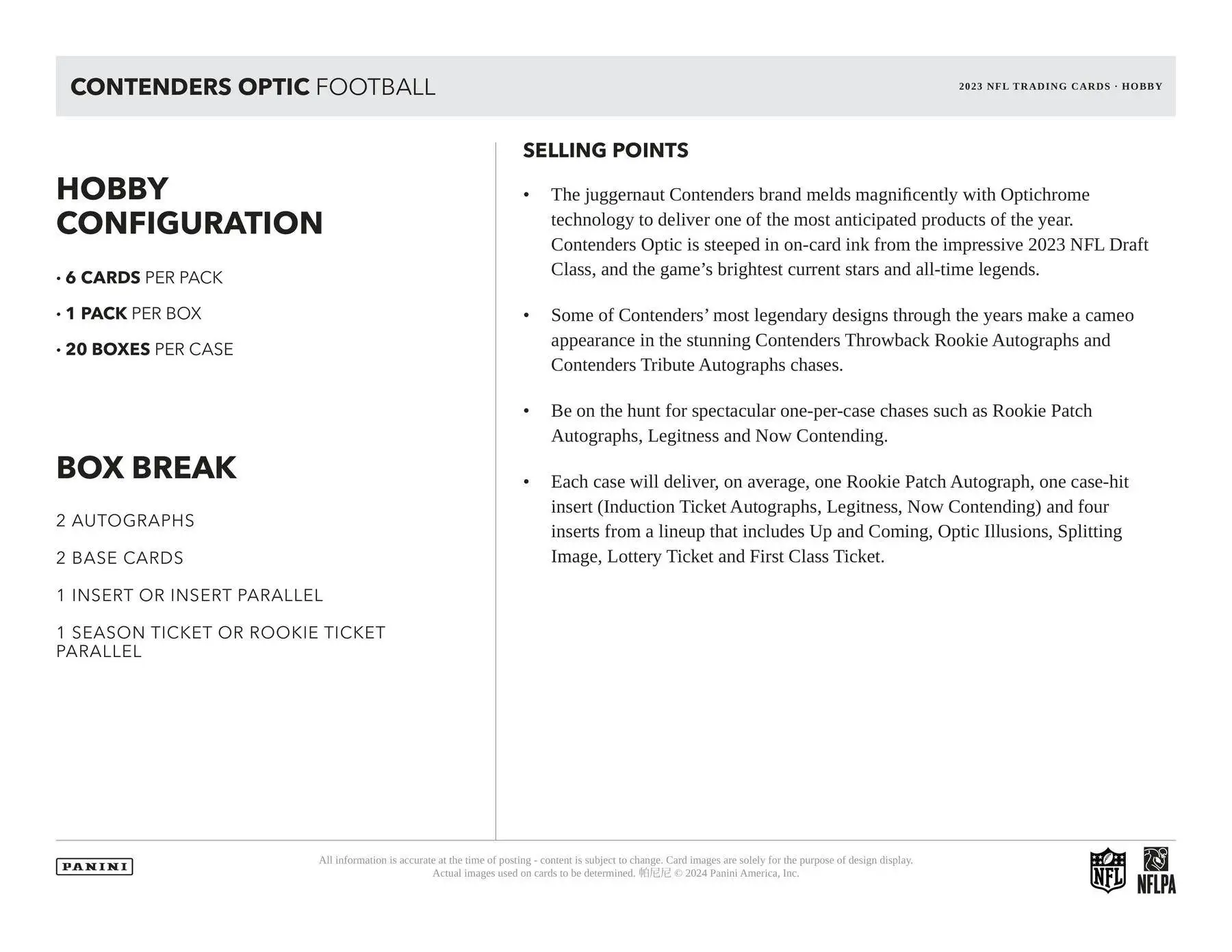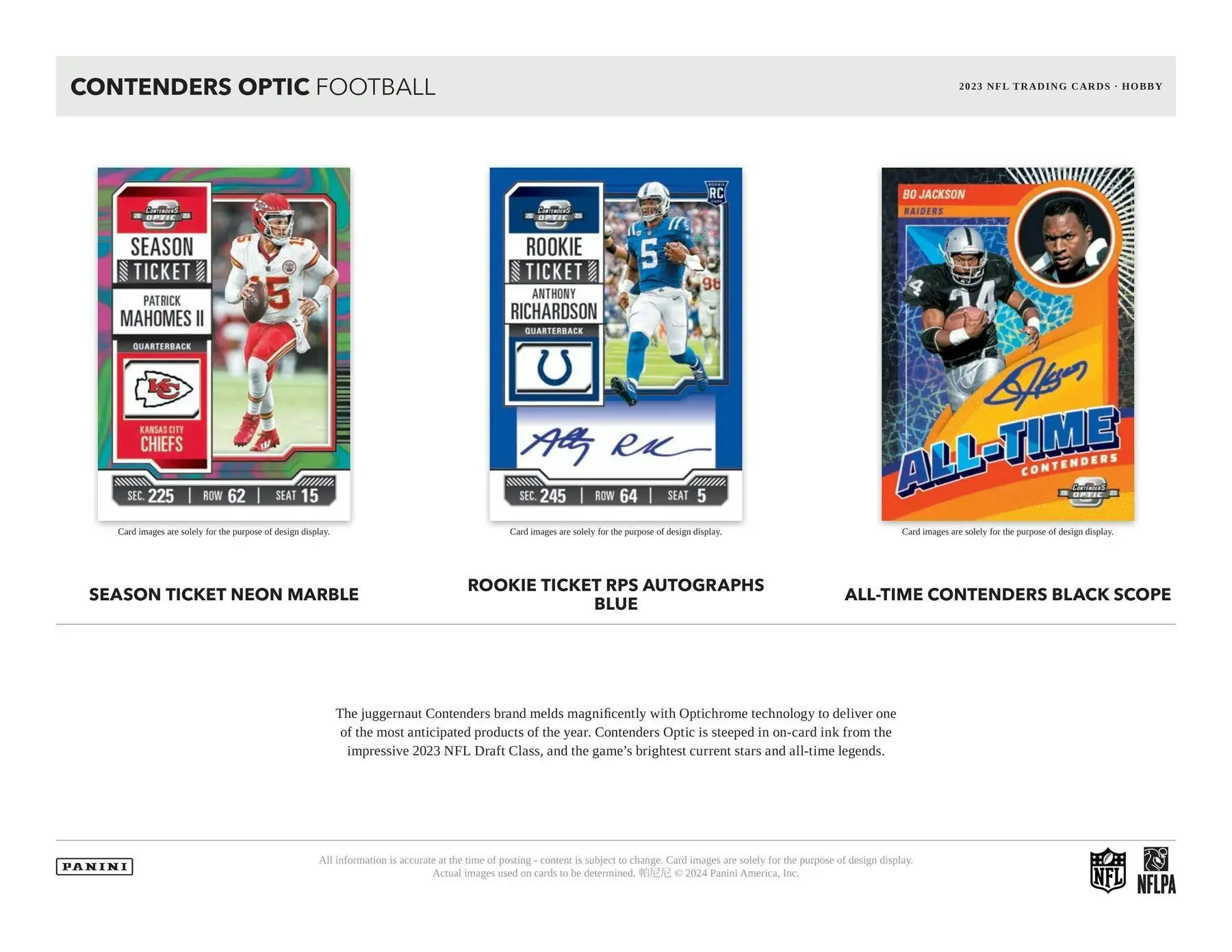 The juggernaut Contenders brand melds magnificently with Optichrome technology to deliver one of the most anticipated products of the year. Contenders Optic is steeped in on-card ink from the impressive 2023 NFL Draft Class and the game's brightest current stars and all-time legends.