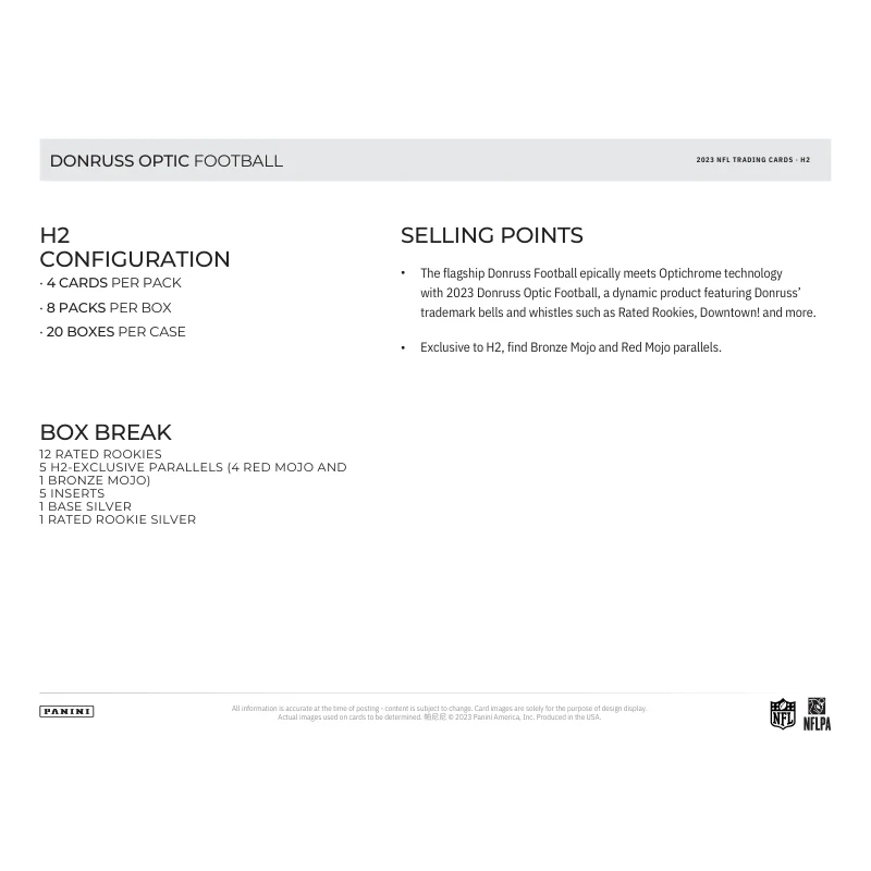 Unleash the thrill of football collecting with the 2023 Panini Donruss Optic Football H2 Hybrid Box, a perfect blend of accessibility and high-end appeal. This hybrid release delivers an exciting mix of the Donruss brand’s iconic Rated Rookies and the Optic technology that collectors love. Dive into the dynamic world of NFL action and secure your box today to experience the excitement of Donruss Optic like never before!