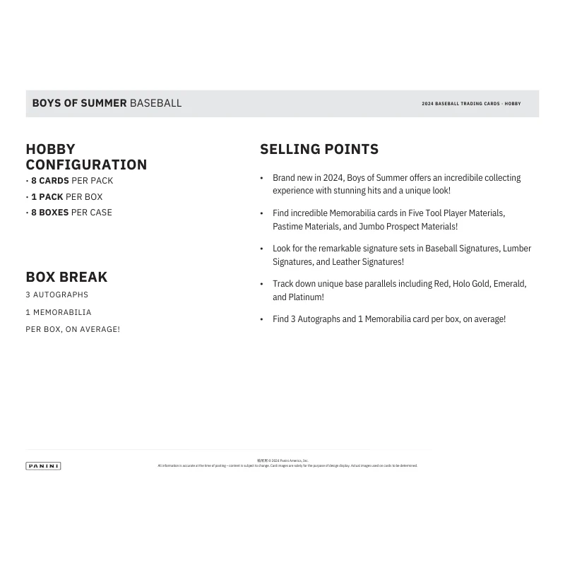 The 2024 Panini Boys of Summer Baseball Hobby Box is a must-have for collectors and baseball enthusiasts alike. This release captures the essence of America's pastime with an array of autographs, memorabilia, and exclusive inserts. Whether you're chasing the latest rookie sensation or adding to your collection of all-time greats, the 2024 Panini Boys of Summer Baseball Hobby Box delivers excitement and timeless appeal.