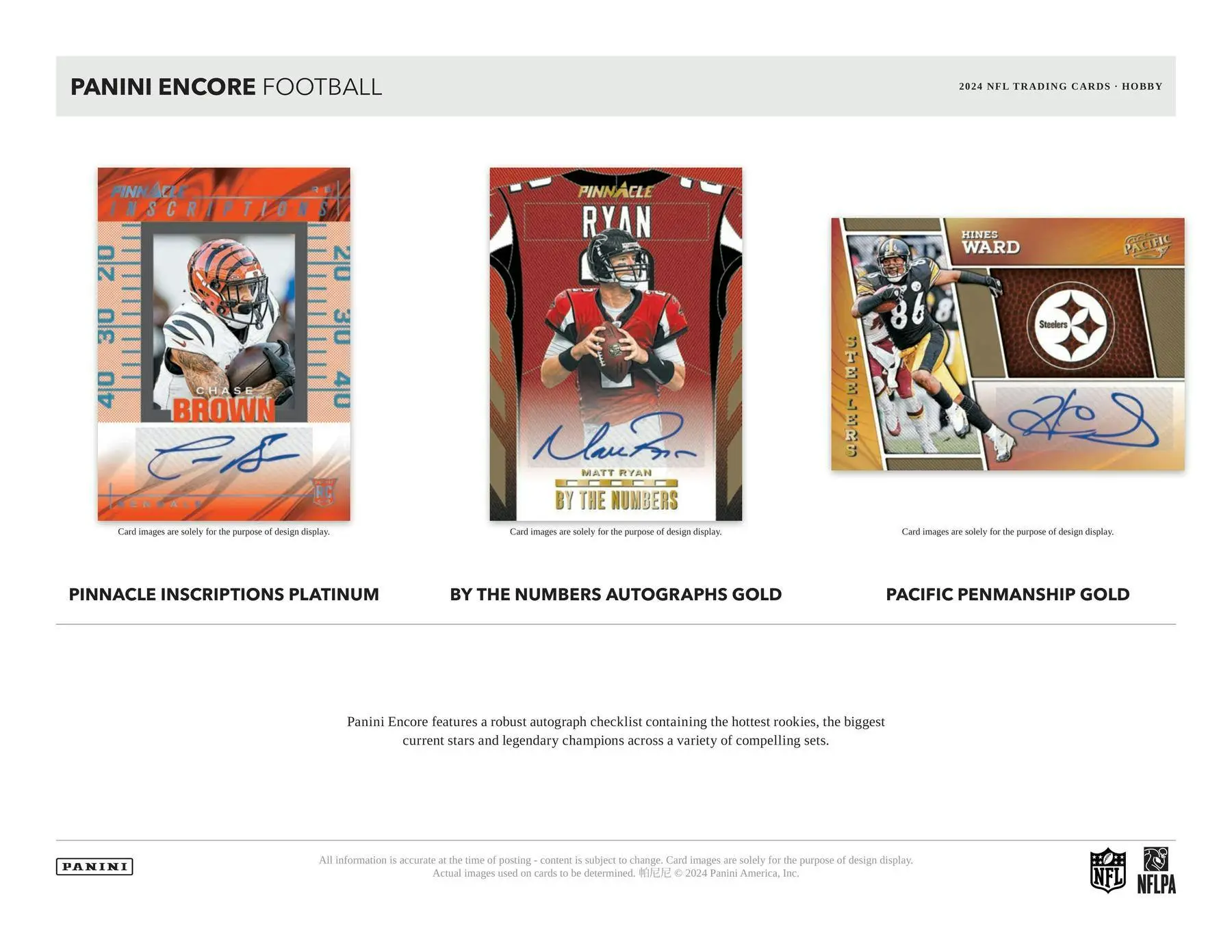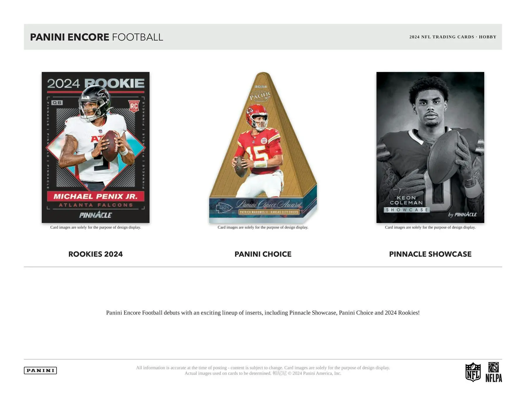 Panini Encore Football debuts with an exciting lineup of inserts, including Pinnacle Showcase, Panini Choice and 2024 Rookies!