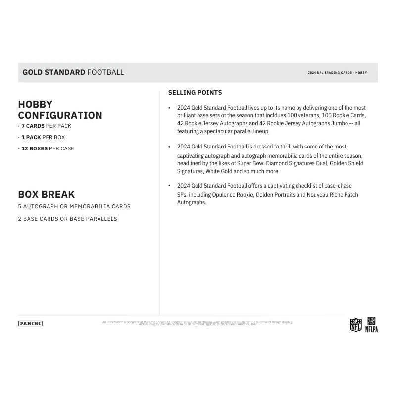 - 2024 Gold Standard Football lives up to its name by delivering one of the most brilliant base sets of the season that incldues 100 veterans, 100 Rookie Cards, 42 Rookie Jersey Autographs and 42 Rookie Jersey Autographs Jumbo -- all featuring a spectacular parallel lineup.