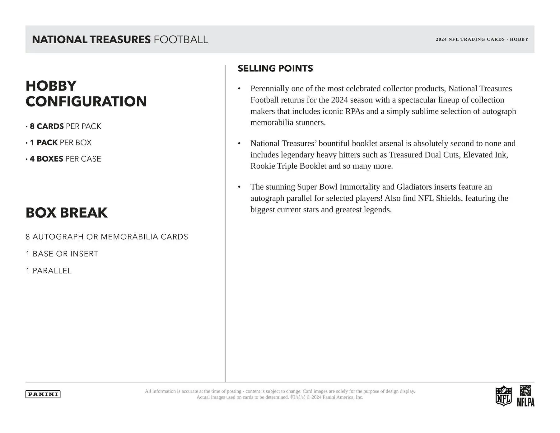 Perennially one of the most celebrated collector products, National Treasures Football returns for the 2024 season with a spectacular lineup of collection makers that includes iconic RPAs and a simply sublime selection of autograph memorabilia stunners.