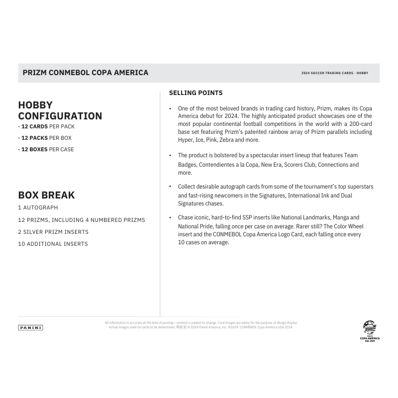 - The highly anticipated 2024 Prizm CONMEBOL Copa America showcases one of the most popular continental football competitions in the world with a 200-card base set featuring Prizm’s patented rainbow array of Prizm parallels including Hyper, Ice, Pink, Zebra and more.