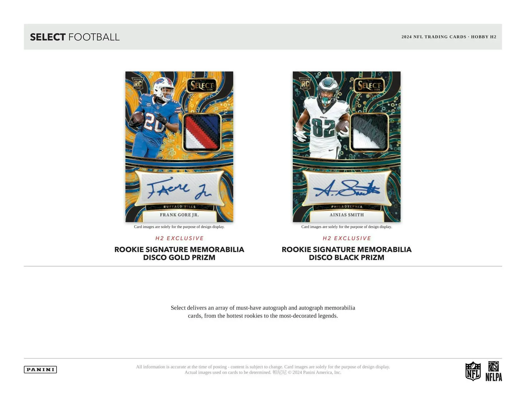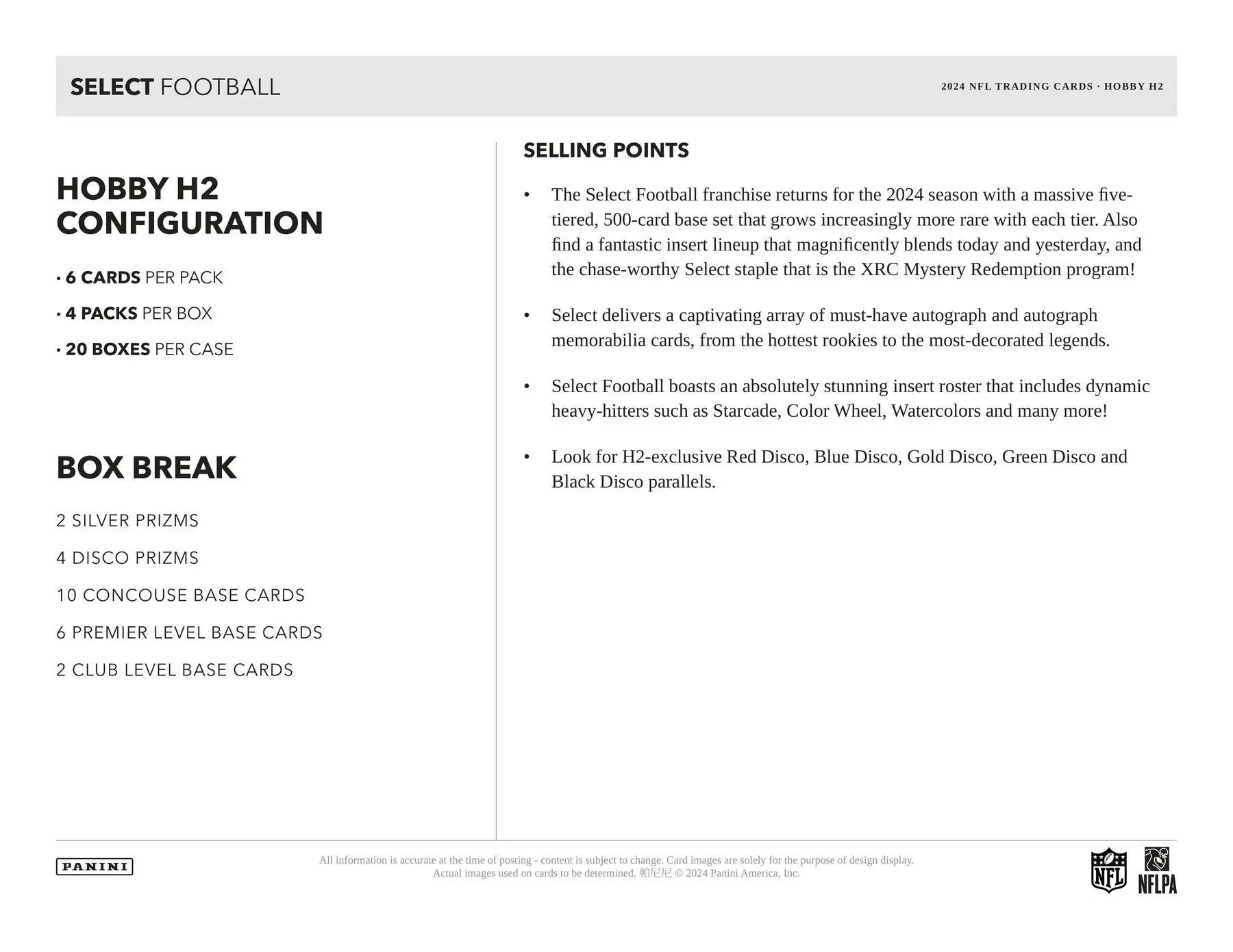 The Select Football franchise returns for the 2024 season with a massive fivetiered, 500-card base set that grows increasingly more rare with each tier. Also find a fantastic insert lineup that magnificently blends today and yesterday, and the chase-worthy Select staple that is the XRC Mystery Redemption program!