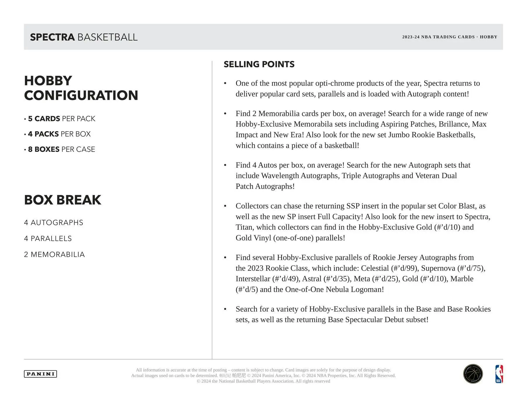 - Collectors can chase the returning SSP insert in the popular set Color Blast, as well as the new SP insert Full Capacity! Also look for the new insert to Spectra, Titan, which collectors can find in the Hobby-Exclusive Gold (#’d/10) and Gold Vinyl (one-of-one) parallels!