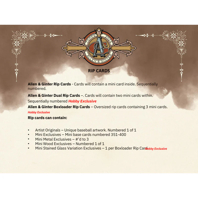• Each Hobby Box of 2024 Topps Allen & Ginter delivers 3 hits, including On-Card Autographs, Relics, Original A&G Buybacks, Book Cards, Cut Signatures, and Rip Cards!