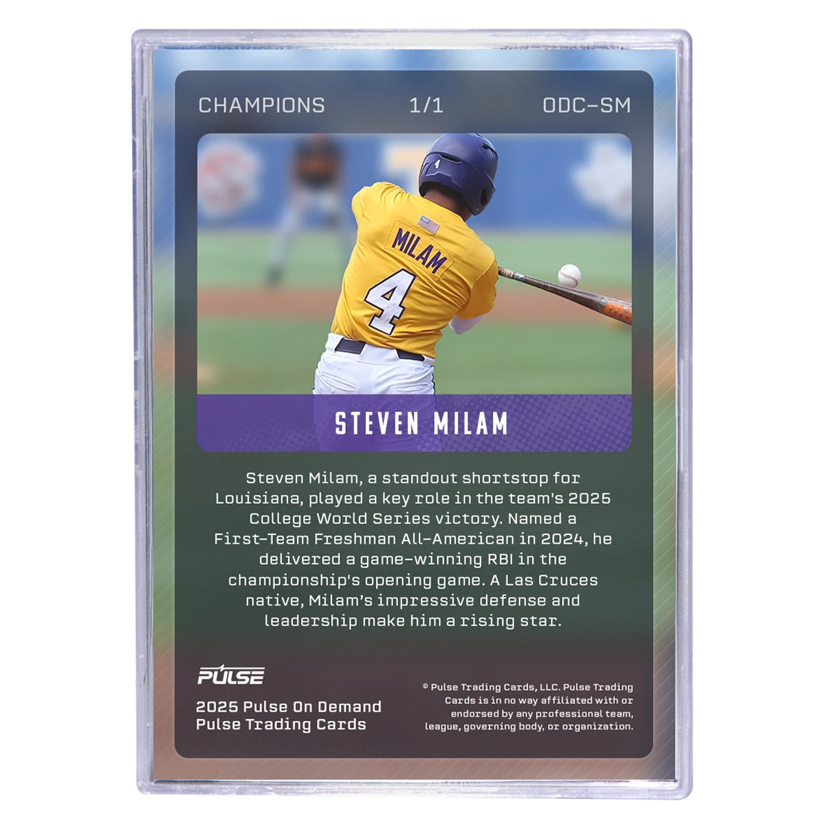 Secure your piece of history with 2025 Pulse On Demand and this autographed card of 2025 College World Series champion Steven Milam — available for a limited time only.